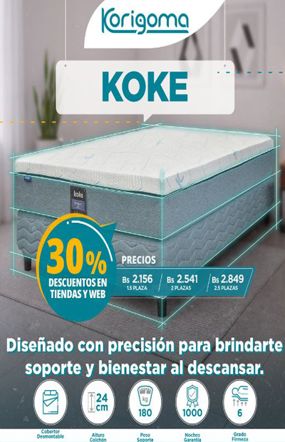 - 30 % descuentoBs. 2.156 – Bs. 4.257Koke, El colchón está diseñado para proporcionar un descanso óptimo mediante la integración de cuatro capas de espumas de alta calidad. Este diseño en capas asegura un equilibrio entre soporte y confort, adaptándose a diversas posiciones de descanso y necesidades de los usuarios.